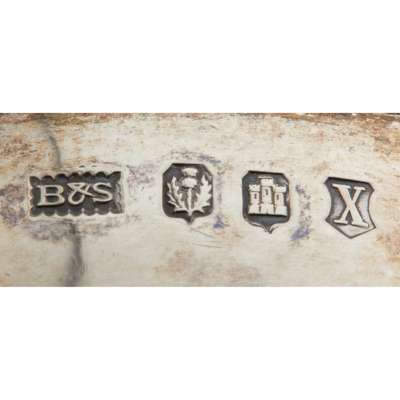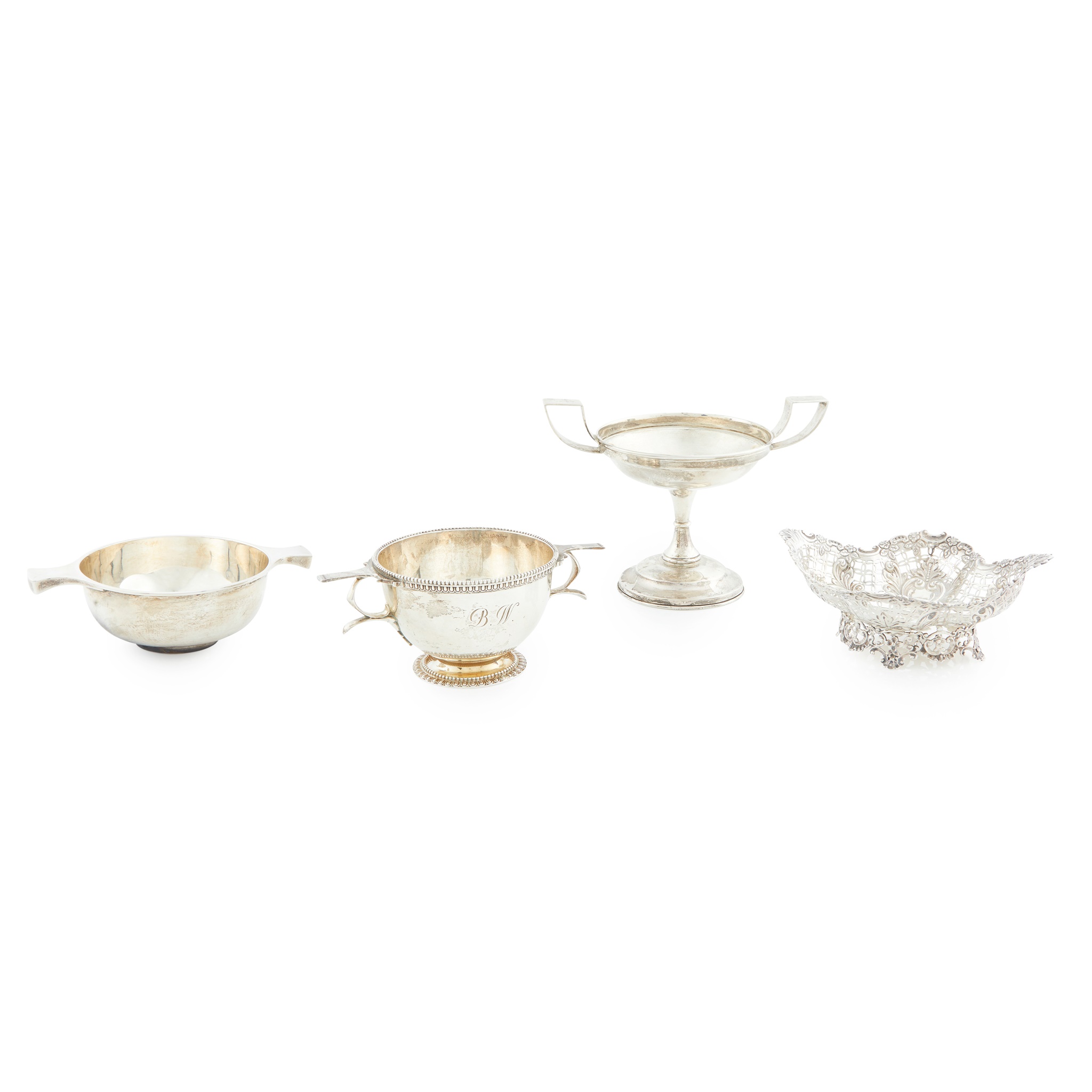 Brook and Sons, Edinburgh 1928; together with a twin handled trophy, Birmingham 1907, of traditional form with angular handles; a twin handled bowl, Goldsmiths & Silversmiths Co Ltd, London 1902, italic B, W engraved to body, beaded rim and a bon bon dish James Dixon & Sons Ltd, Sheffield 1901, of moulded oval form with pierced raised sides