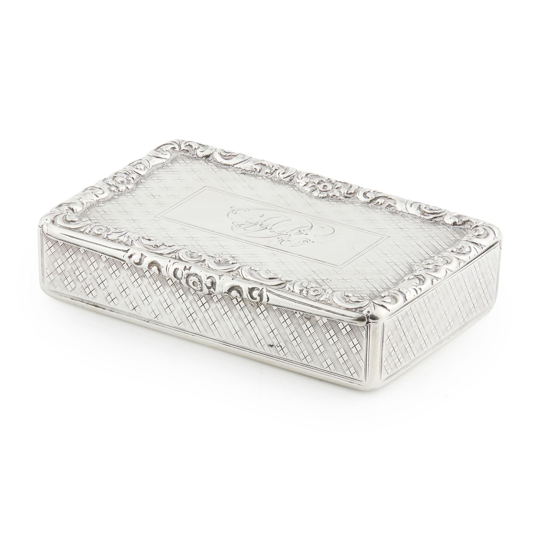 James Nasmyth, Edinburgh 1836, of rectangular form, cross-hatch engraved detail throughout, the hinged lid with a scroll and foliate border, rectangular cartouche to centre with engraved italic WR initials, engraved to the underside of the lid Wm ROBERTSON, DALKEITH