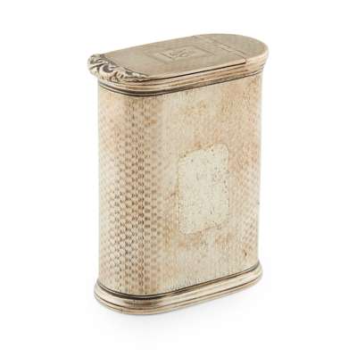 James Nasmyth, Edinburgh 1832, of oval cylindrical form, all over feathered detail, the hinged lid with cast floral detail and cartouche with engraved Lion rampant detail, the underside engraved JG/ to/ RG/ 1840