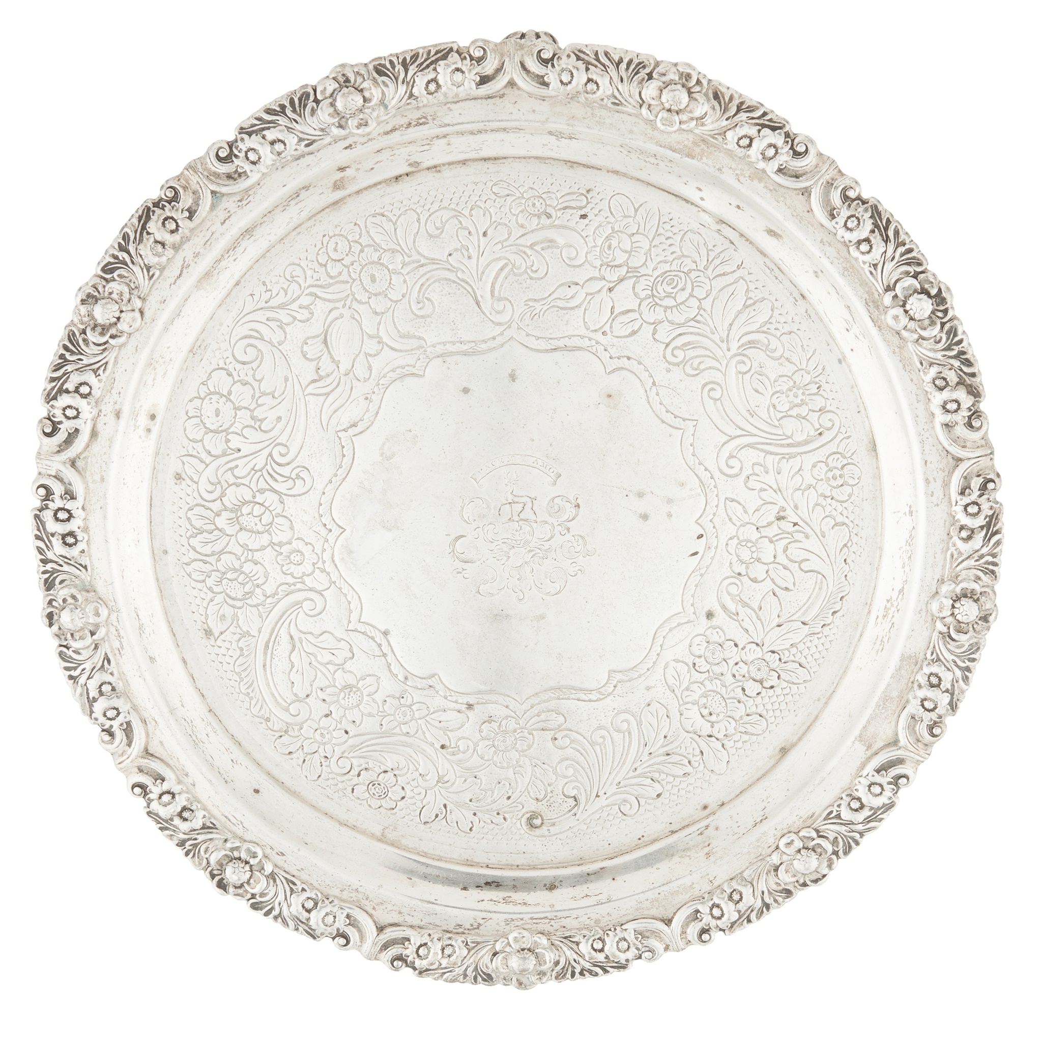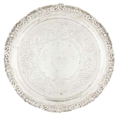 J W Howden & Co, Edinburgh 1817, of circular outline with cast floral border, the flat with engraved floral decoration and crest with motto to the centre, raised on three bracket feet