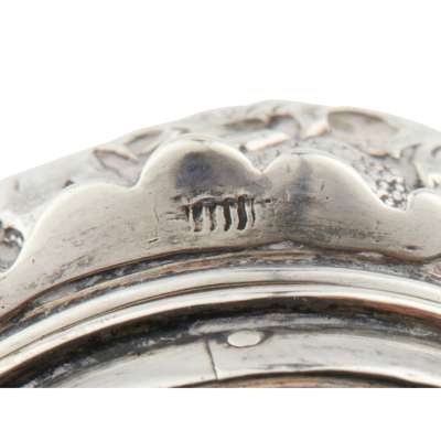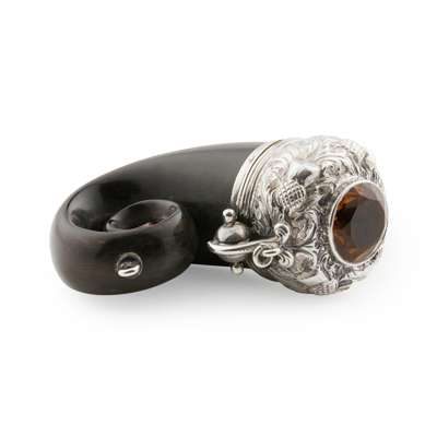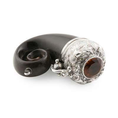 maker's mark only, S&S, late 19th century possibly Sanderson of Edinburgh, of traditional coiled form, the domed hinged lid with all-over embossed thistle decoration, collet set with a facetted citrine