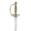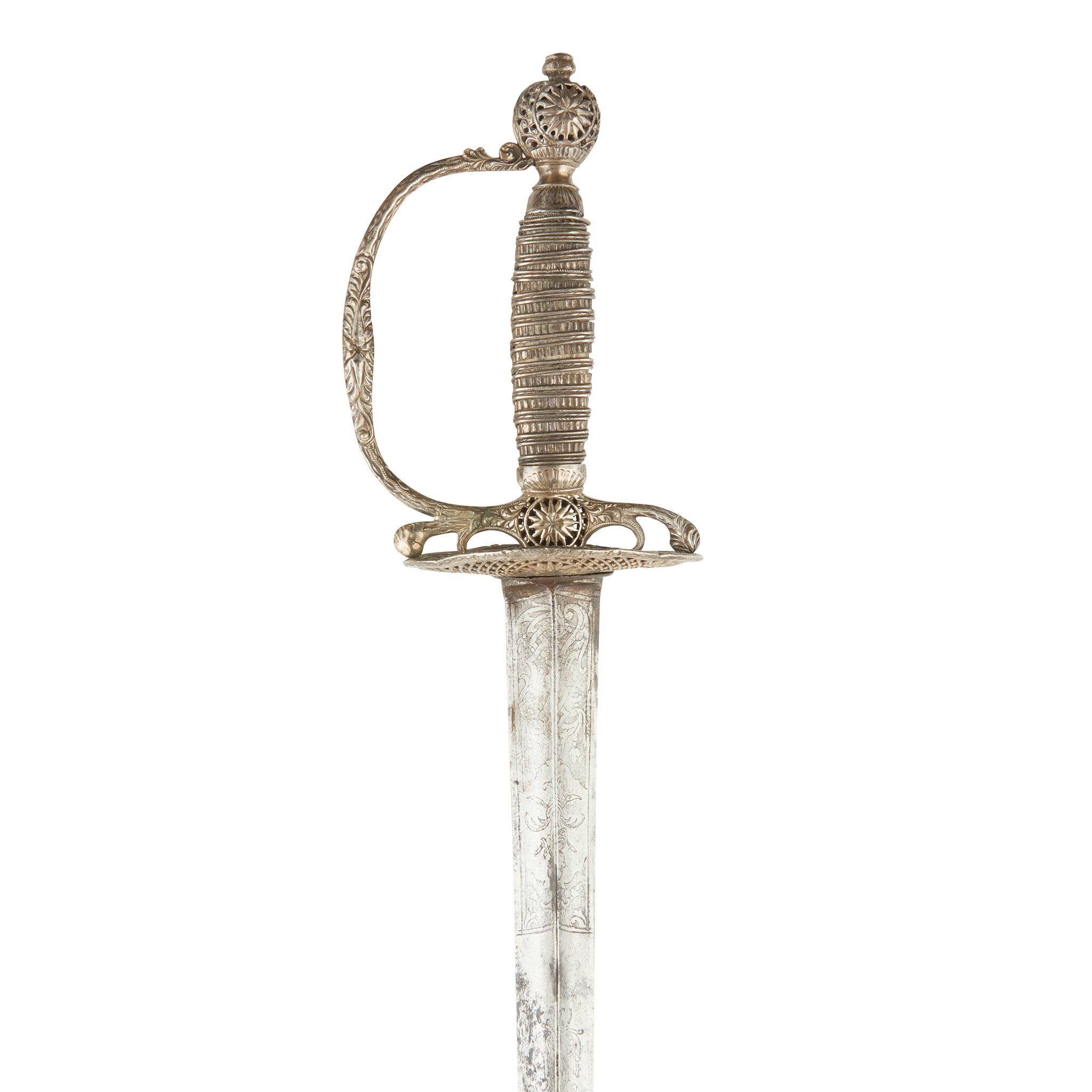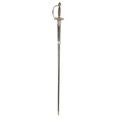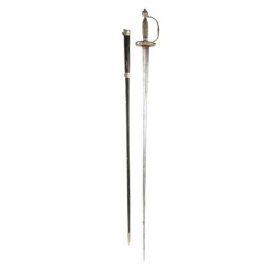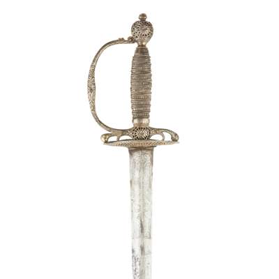 indistinctly marked, maker's mark CL/ABF, London, the hilt pommel and guard with finely pierced lattice decoration and stylised star motif, with wire bound grips, with triangular section tapered blade, with foliate scrolls and classical bust, the lacquered wooden scabbard with silver mounts with stylised star motif and scroll decoration, engraved Steven's Template Gate