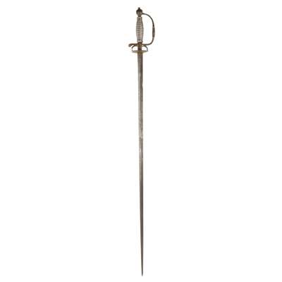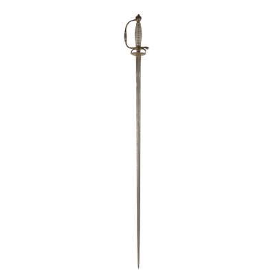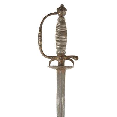 the pommel and guards with traces of inlaid gold and gilding, decoration unclear, with silver wire bound grip, with triangular section tapered blade