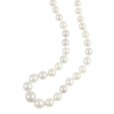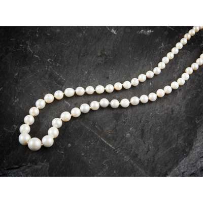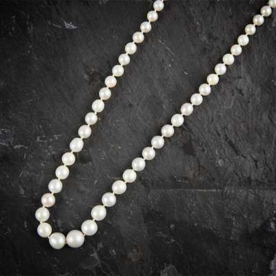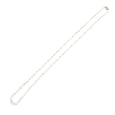 composed of a row of graduated natural freshwater Scottish river pearls, the clasp millegrain set with round-cut diamonds to either side