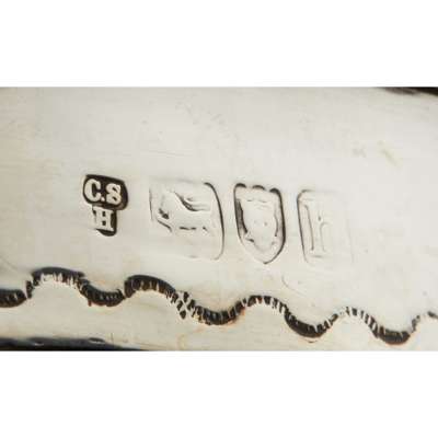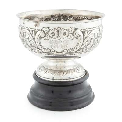 Charles Stuart Harris, London 1903, of traditional circular form, cast rim of plain form, the body with an embossed rose and foliate decorated border with two cartouches to each side, one with engraved foliate initials GEP and AAP to the other side, raised on a domed circular foot with foliate decoration, with associated wooden plinth
