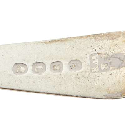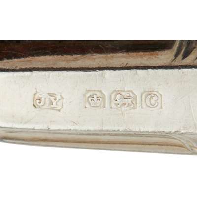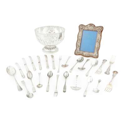 Charles Edwards, London 1896, of demi-fluted circular form, presentation engraving to the front of body, '...to CAPt COLIN MITCHELL... in recognition of kind services rendered...' raised on domed circular foot; together with a Victorian silver mounted frame, a cased set of silver handled fruit knives and a collection of flatware to include a teaspoon by William Hannay of Paisley