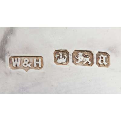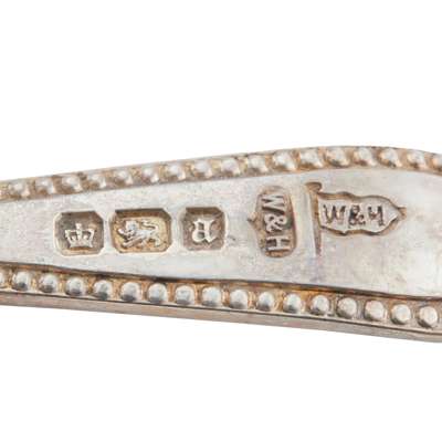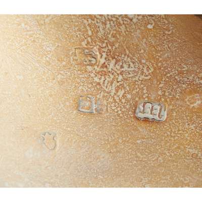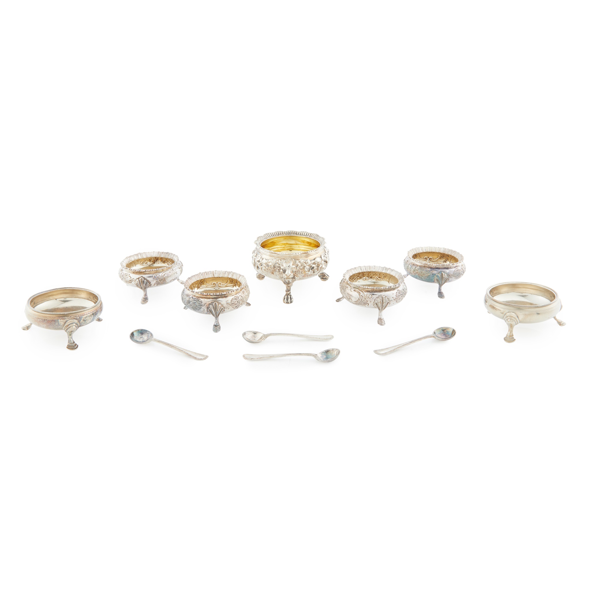 Walker & Hall, Sheffield 1893, each of circular form, gadrooned border, the body with embossed floral decoration, each raised on three hoof feet, the spoons with beaded border, presented in a fitted velvet and silk case; together with a Georgian pair, raised on three hoofed feet and another with gadrooned border, embossed decoration, the legs with lion mask and paw feet
