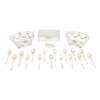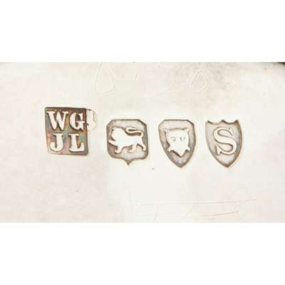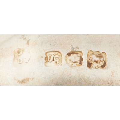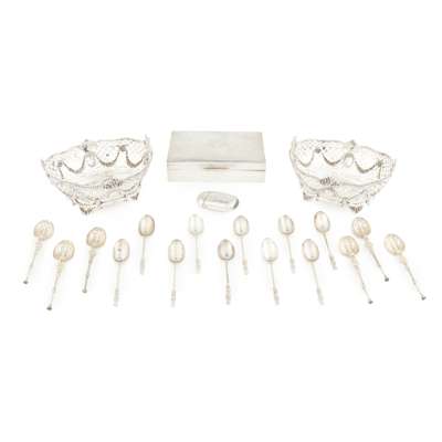 London 1893, Gibson and Langham, of oval form, beaded border, reticulated design laurel swags, shell bracket feet, with a table playing card box, velvet divided interior; set twelve apostle coffee spoons; cased set of silver gilt anointing spoons