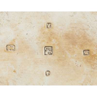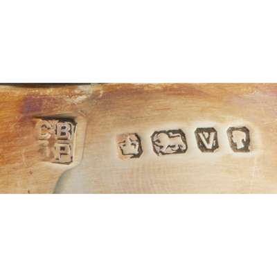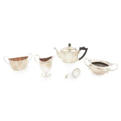 Roberts & Belk, Sheffield 1888, comprising teapot, twin handled sugar basin and helmet milk jug, all of oval outline verticle fluted detail to body, the handles with ribbed detail; together with a sugar basin, Edward Barnard & Sons Ltd, 1891 of squat circular form with fluted body and cast shell and gadrooned border with scroll handles and a caddy spoons with cherubic decoration