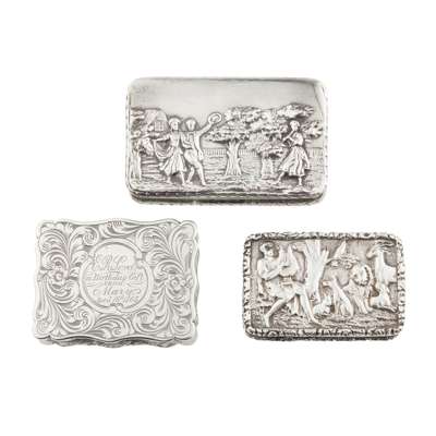 to include a Victorian vinaigrette, AT, London, of moulded rectangular form, chased scroll detail throughout with presentation engraving to centre, '...birthday gift from Mary...1865' and another John Thropp, Birmingham, with an embossed Classical depiction to hinged lid with foliate border; together with a modern snuff box, D J Silver Repairs, London with embossed pastoral depiction to hinged lid