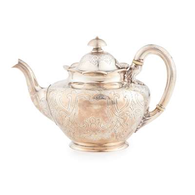 Edward Pairpoint & George Wood London 1857, of tapering circular form, engraved floral and scroll motif decoration throughout, vacant cartouches to either side of body, the domed lid with similar decoration, domed finial and scalloped border, the C scroll handle foliate clasped, raised on a circular foot