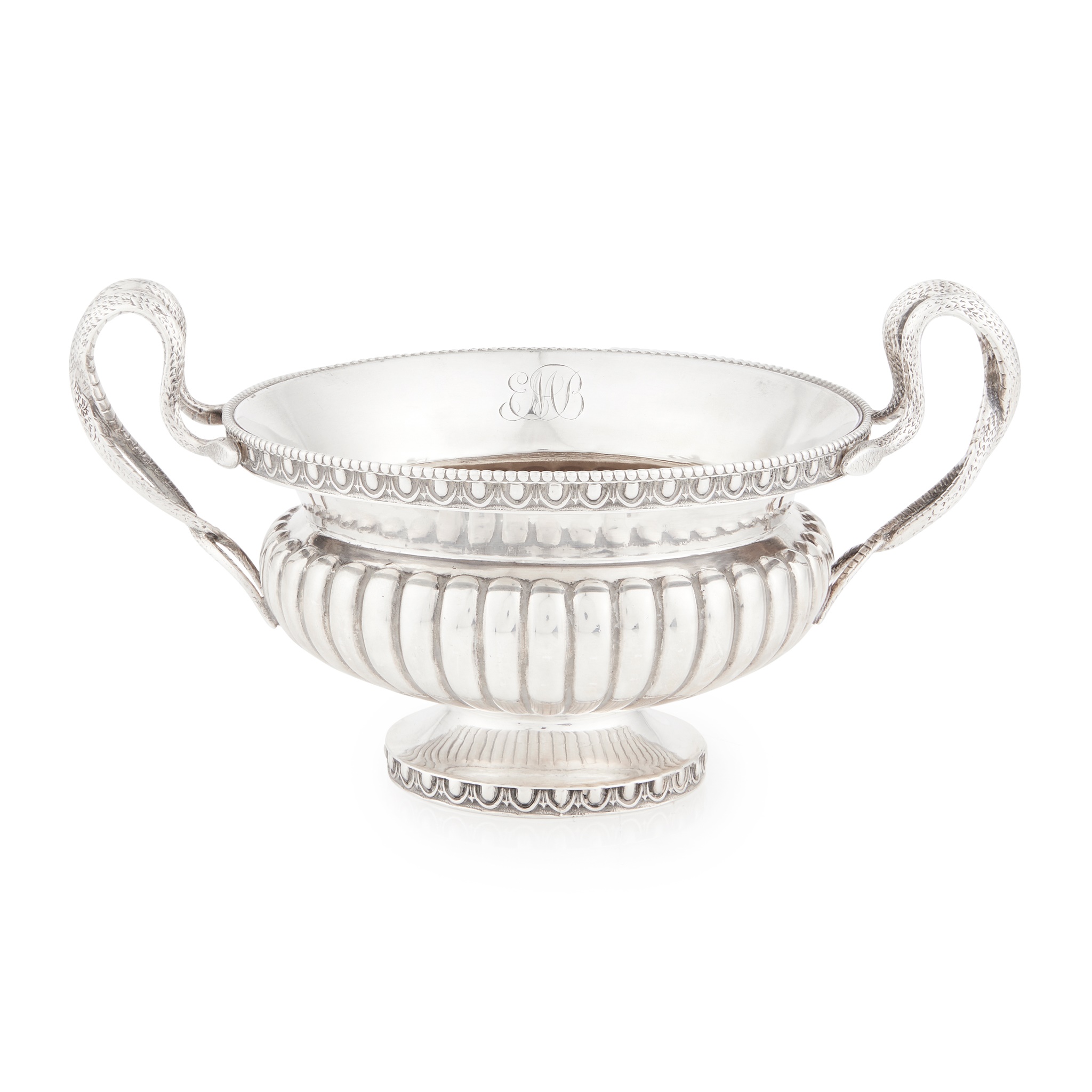 Richard Sawyer, Dublin 1847, of squat circular vase form, the body demi-fluted with gadrooned border with egg and dart frieze, scrolling serpent handles, and on spreading foot