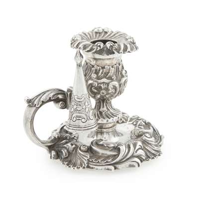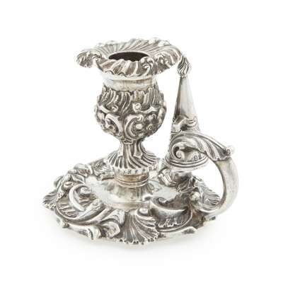 Robert Gainsford, Sheffield 1823, of cast foliate and scroll design, leaf clasped handle with chased conical snuffer