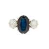 claw set with an oval-cut sapphire, flanked to either side by a round brilliant-cut diamond, to a plain shank stamped PLAT