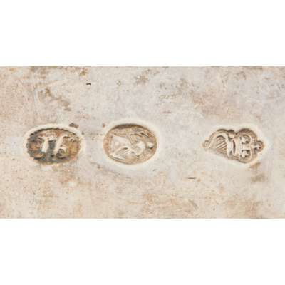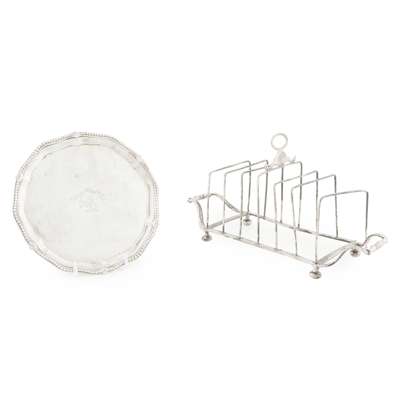 Robert Breading, Dublin 1807, of rectangular form, composed of six compartment, with scroll and knopped handles, raised on four bun feet; together with a waiter, John Laughlin, Dublin date letter lacking, of moulded circular form with beaded border, crest and mott engraved to centre, raised on three hoof feet