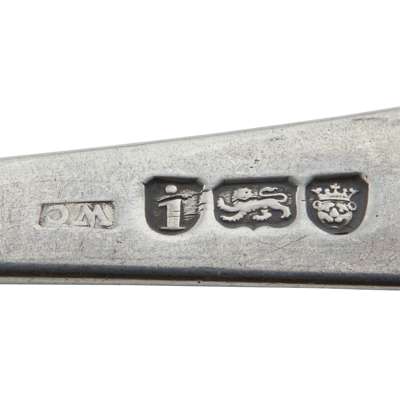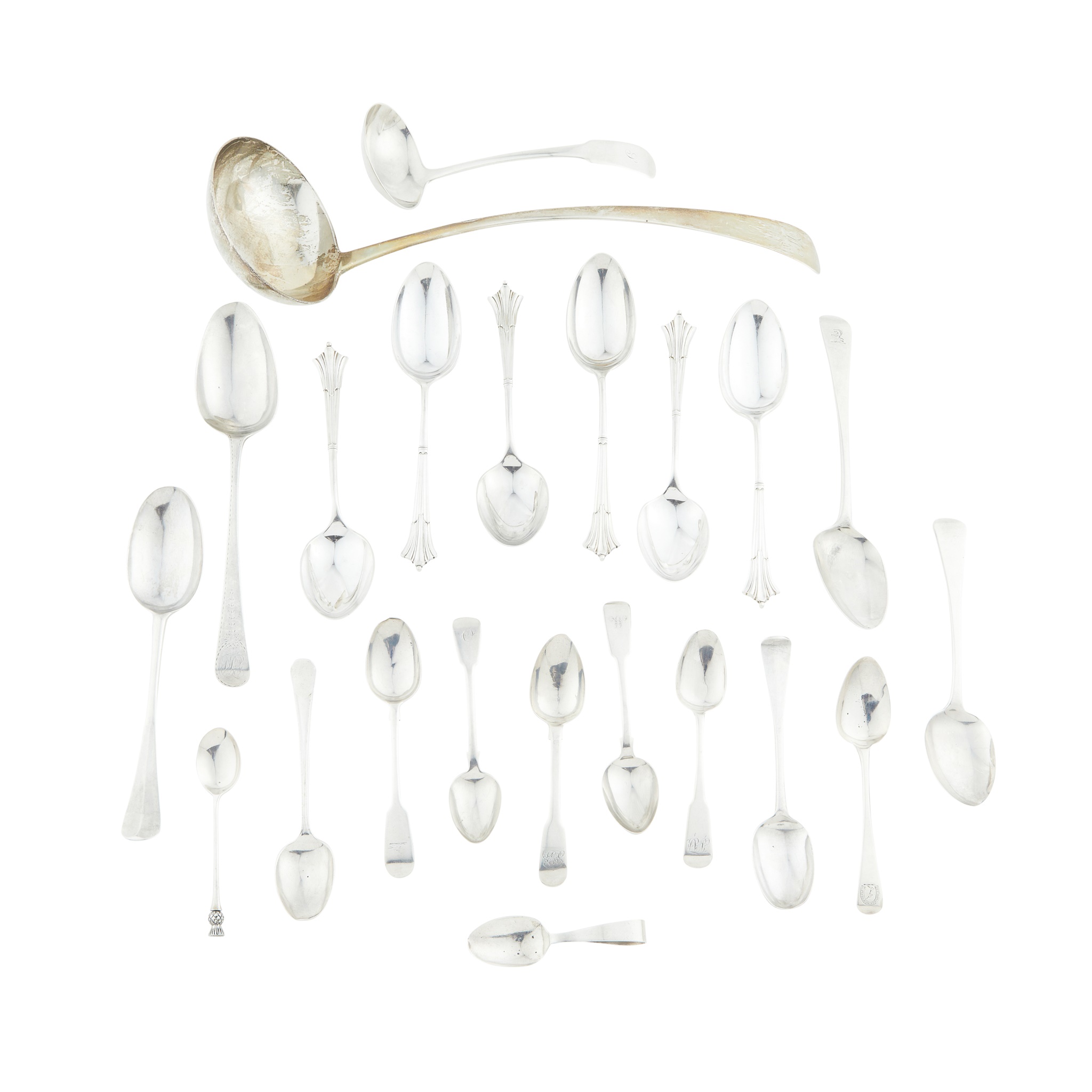 to include; a Scottish George III soup ladle, W Cunningham, Edinburgh, 1811, of Old English pattern, five various 18th century table and dessert spoons including one Irish; six double struck Onslow type dessert spoons; ten other silver spoons