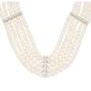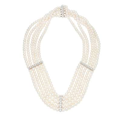composed of five rows of cultured pearls, set with three vertical spacers, each set with nine round brilliant-cut diamonds, to a rectangular slide clasp, stamped 750