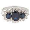 claw set with an oval-cut sapphire, flanked to either side by a round-cut sapphire, in a border of round brilliant-cut diamonds, to a plain shank, indistinctly marked