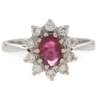 claw set with an oval-cut ruby, in a border of ten small round brilliant-cut diamonds, to a plain 18ct white gold shank