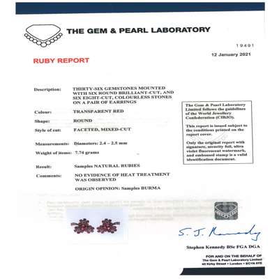 each modelled as a floral cluster of three brilliant-cut diamonds in a border of round-cut rubies, to an eight-cut diamond set stem, post and butterfly fittings, unmarked; together with an accompanying report by The Gem & Pearl Laboratory, dated 12.02.2021, numbered 19491, stating that the rubies are of Burmese origin showing no evidence of heat treatment
