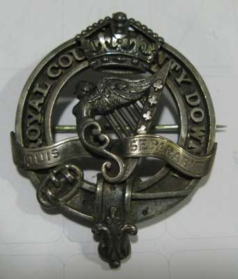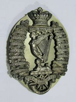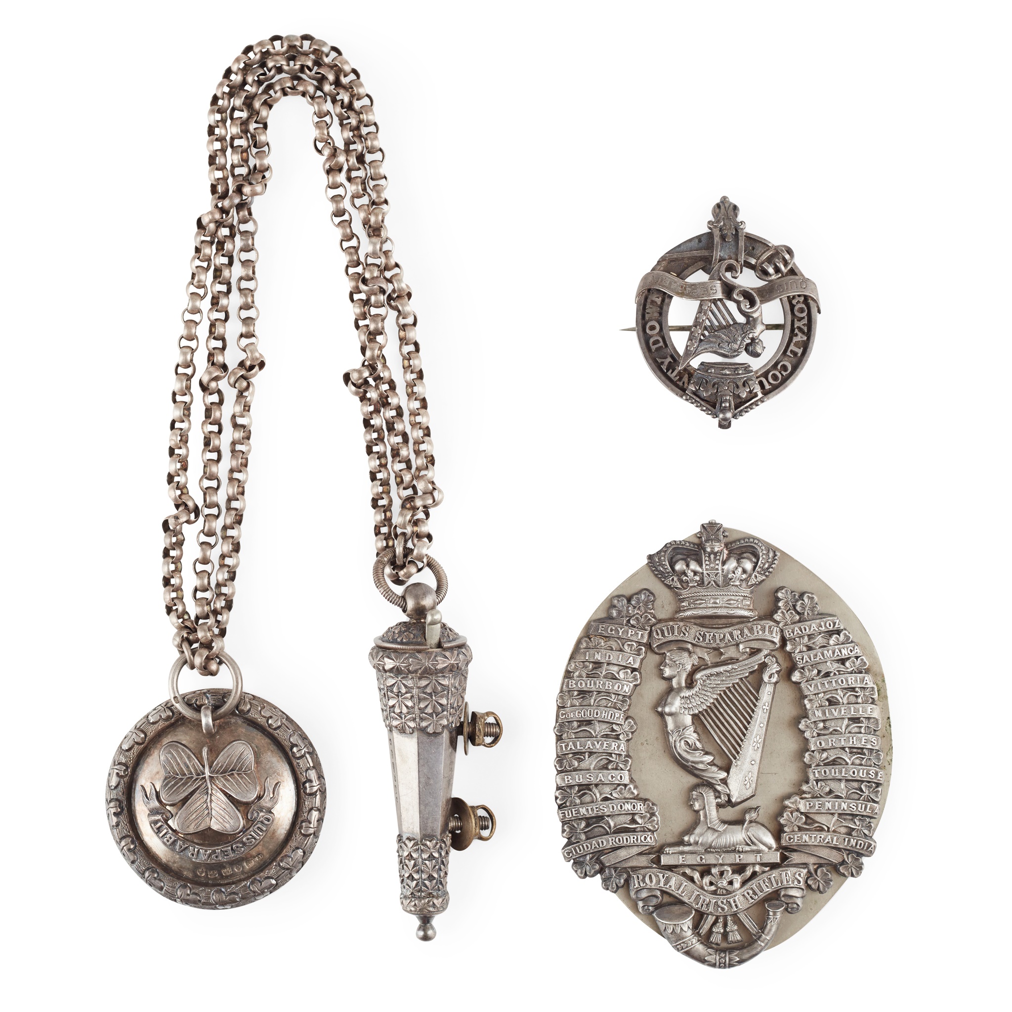 Joseph Jennens and Co., Birmingham 1881, the whistle and holder of traditional form, fully marked as is the badge, the crossbelt badge and backing plate, not marked, with battle honours and regimental crest and motto; together with a cap badge for the Royal County Down 86th Reg't, engraved to the rear C H Scott-Plummer 86th Reg't
