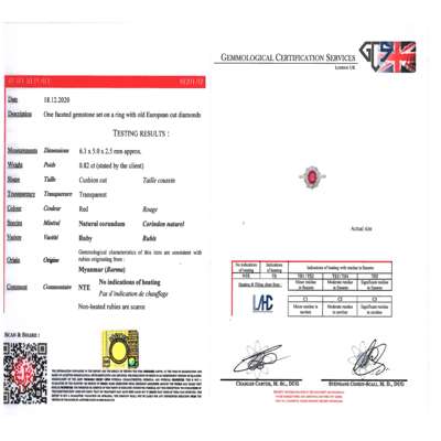 claw set with an oval-cut Burmese ruby, in a single border of ten old European-cut diamonds, to a plain unmarked shank; with accompanying report by Gemmological Certification Services, dated 18.12.2020, numbered 81291-92, stating that the ruby is of Burmese origin, showing no indications of heat treatment