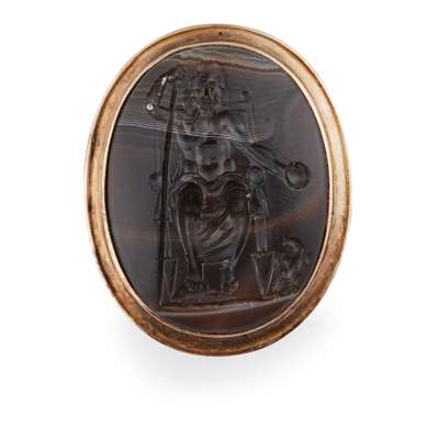 the oval hard stone carved with a King (possibly Jupiter) seated on a throne, holding an orb and a spear, bird at the throne leg in a plain yellow gold rub-over setting and shank