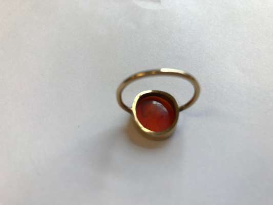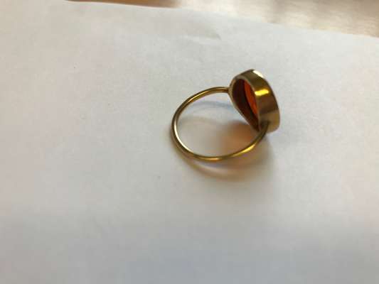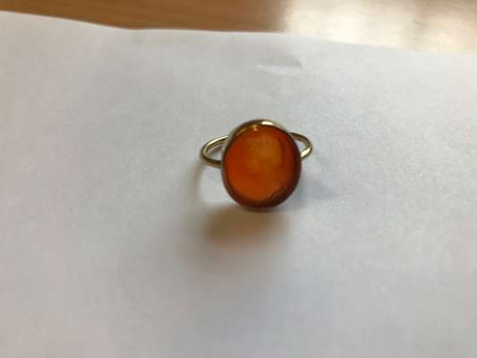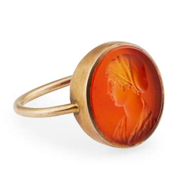 the oval hard stone carved with bust of a lady to sinister wearing a headscarf in a plain rub-over mount and round section shank