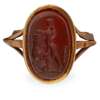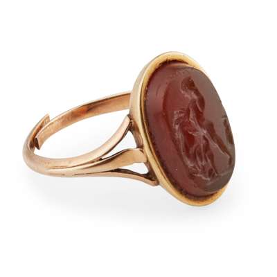 intaglio possibly Roman, 2nd century A.D, the oval hard stone carved with the figure of Heracles wrestling the Nemean lion in a rub-over mount on a split shoulder plain shank in yellow gold