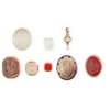 an early 19th century gold fob seal with chalcedony matrix of initials; another of canted rectangular form, engraved hardstone matrix with crest and motto 'fier mais sensible' (High spirited yet sensible); a small fob seal with matrix of two pyramids and script; two small watch keys with inset hardstone; an unmounted matrix with arms and motto for the Baird family; a quartz engraved oval matrix with ribbon swagged shield and motto 'quod tibi non alteri' (you do not have another); a small matrix of rounded rectangular form with a head in profile