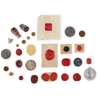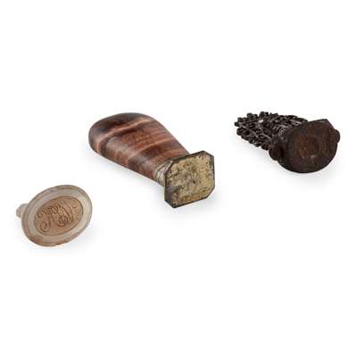 to include: a 17th/early 18th century all steel swivelling triple fob seal with ornate scrolling handle, slide to allow the triple matrix to revolve, (see footnote), Hazelwood school tokens (x 4), Maria Theresa Thaler; white metal medallions for the prevention of the assassination George III and presentation of colours to Birmingham loyal society, a medallion for Gutenberg anniversary, agate handled desk seal, a fob seal a/f, all in a 19th century mahogany box
