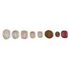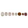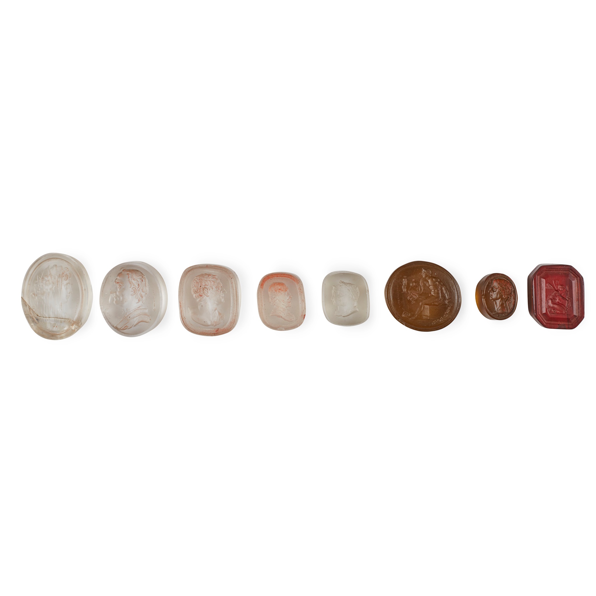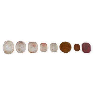 oval clear with female head, inscribed 'HARRIS'; oval clear with male head, spear head or club behind his head; rounded rectangular, clear male head; rounded rectangular, with male head with beard; clear rounded rectangular with double profiles of two Greek women; round yellow coloured, seated male figure with another figure on a pedestal inscribed in Greek indistinctly; oval, yellow with male head and tail(?) curling up behind his head and a star at his forehead; canted rectangular brown hardstone carved with a female archer with wings and a quiver of arrows