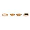 to include an 18ct gold signet ring, an 18ct band with engraved detail; a 9ct gold signet ring, and a green hardstone set ring, stamped 9c