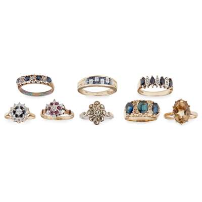 to include a 9ct gold sapphire and diamond set ring, set with three large oval-cut sapphires and eight-cut diamond detail; a 9ct gold sapphire and diamond set ring with Greek-key pattern; a 9ct gold marquise shaped sapphire and diamond set ring, a 9ct gold five stone sapphire and diamond set ring, three further 9ct gold gem set rings and a marcasite set cluster ring