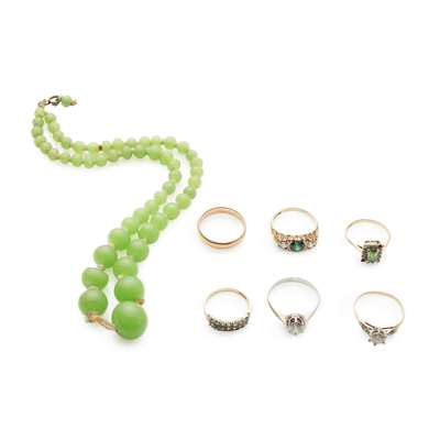 to include a single stone diamond ring, claw set with an old round-cut diamond, to a plain yellow metal shank, stamped 18CT; together with a 9ct gold double row diamond set ring, an 18ct gold wedding band; a 9ct gold green and colourless gem set ring, a green and colourless gem set cluster ring; two imitation diamond rings and a single strand of green glass beads