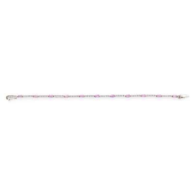 composed of bar links each set with six small round brilliant-cut diamonds and alternating claw set oval pink sapphires, to a concealed clasp and safety clip, stamped 14k