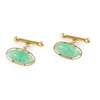 set with a single cultured pearl, each shoulder collet set with three round brilliant-cut diamonds, the shank stamped 850; together with a pair of jade set cufflinks, the principal terminals claw set with carved jade plaques, set in yellow metal to a T-bar secondary terminal