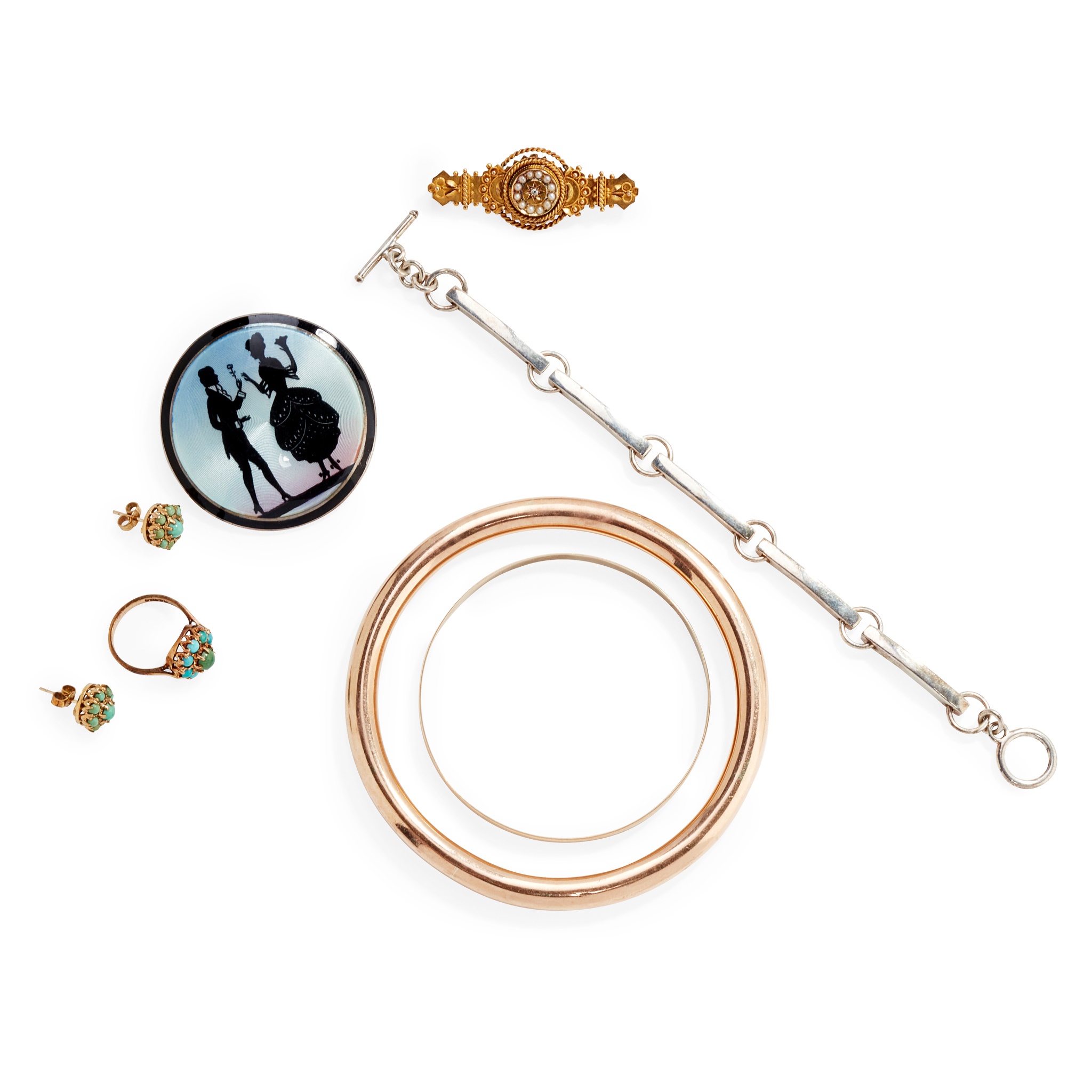 to include a 15ct gold pearl and diamond set Victorian brooch, a 9ct gold turquoise cluster ring and matching earrings; two bangles, stamped 9cts; a silver bracelet and a circular enamelled brooch depicting two silhouettes