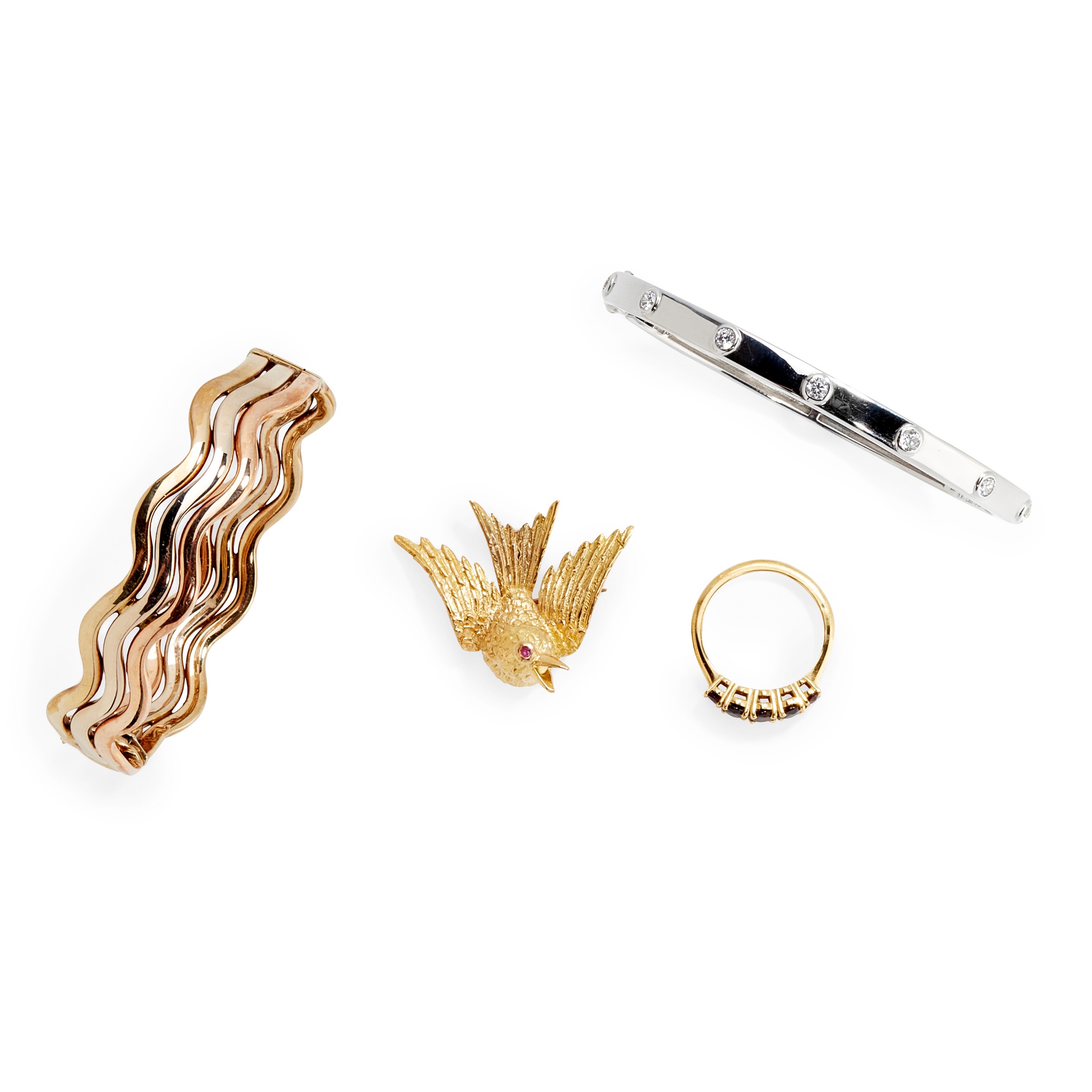 to include a 9ct tri-coloured gold bangle of wavy design, an 18ct gold five stone garnet set ring; an unmarked yellow metal bird brooch, with small round-cut ruby eyes, and a gem set Ti Sento bracelet, stamped 925