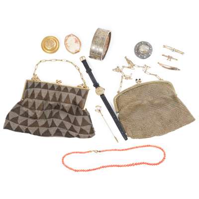 to include a large yellow metal circular Victorian brooch, a cameo brooch, both unmarked; three further bar brooches, an opal and garnet set pin; a coral bead necklace; a Victorian silver bangle; a Scottish brooch, a lady's Omega wrist watch and two mesh purses