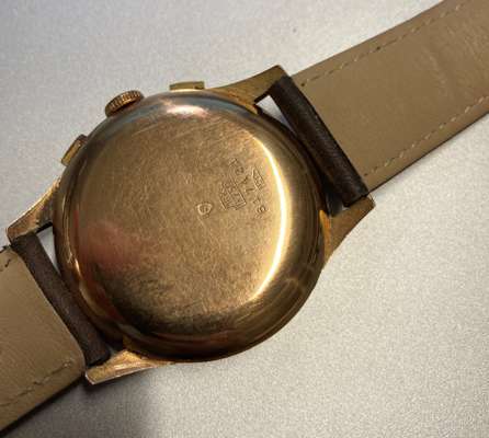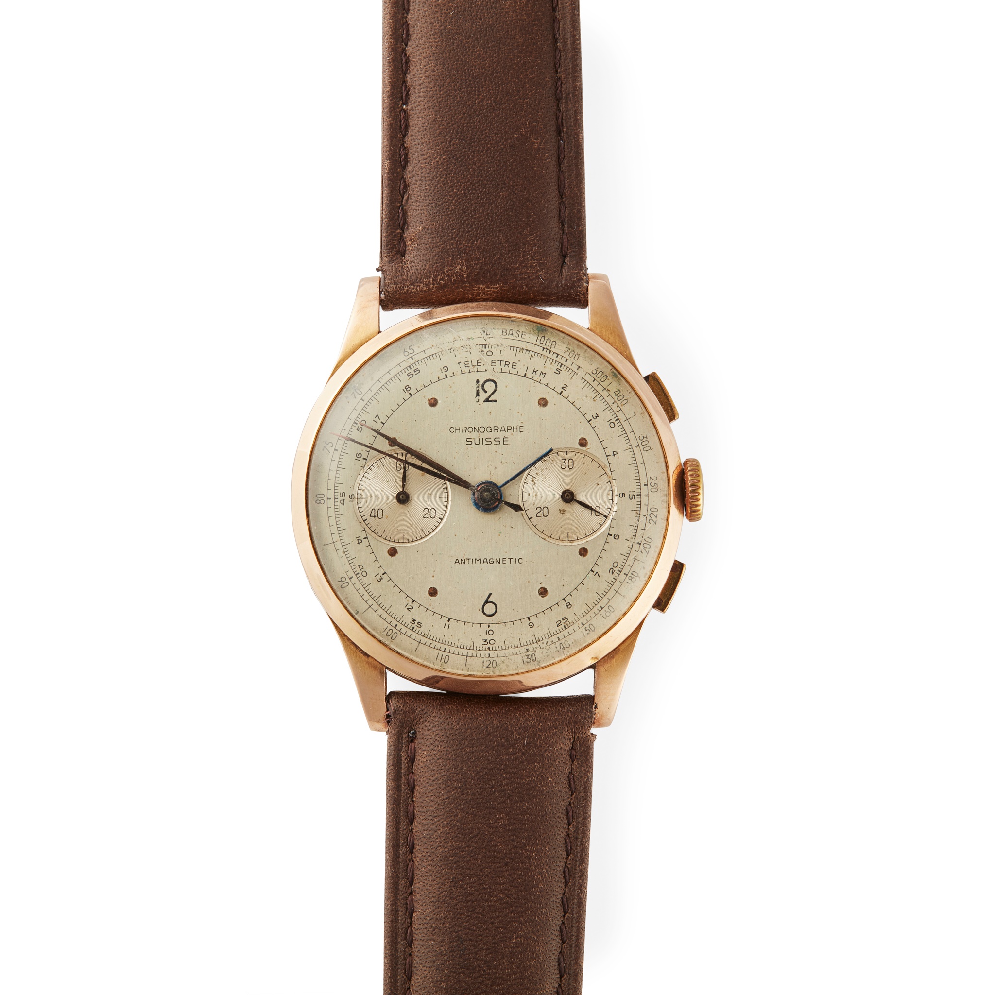 1940s, 18ct gold case with unsigned manual wind movement, round silver coloured dial with Arabic 12 and 6 and dot hour markers, sunken subsidiary 30 minute register and small seconds at 3 and 9, outer telemetre scale, seconds and tachymeter scales in black, leaf style hands, crown and two push buttons, metal movement cover, on a modern generic strap, lacking box and papers