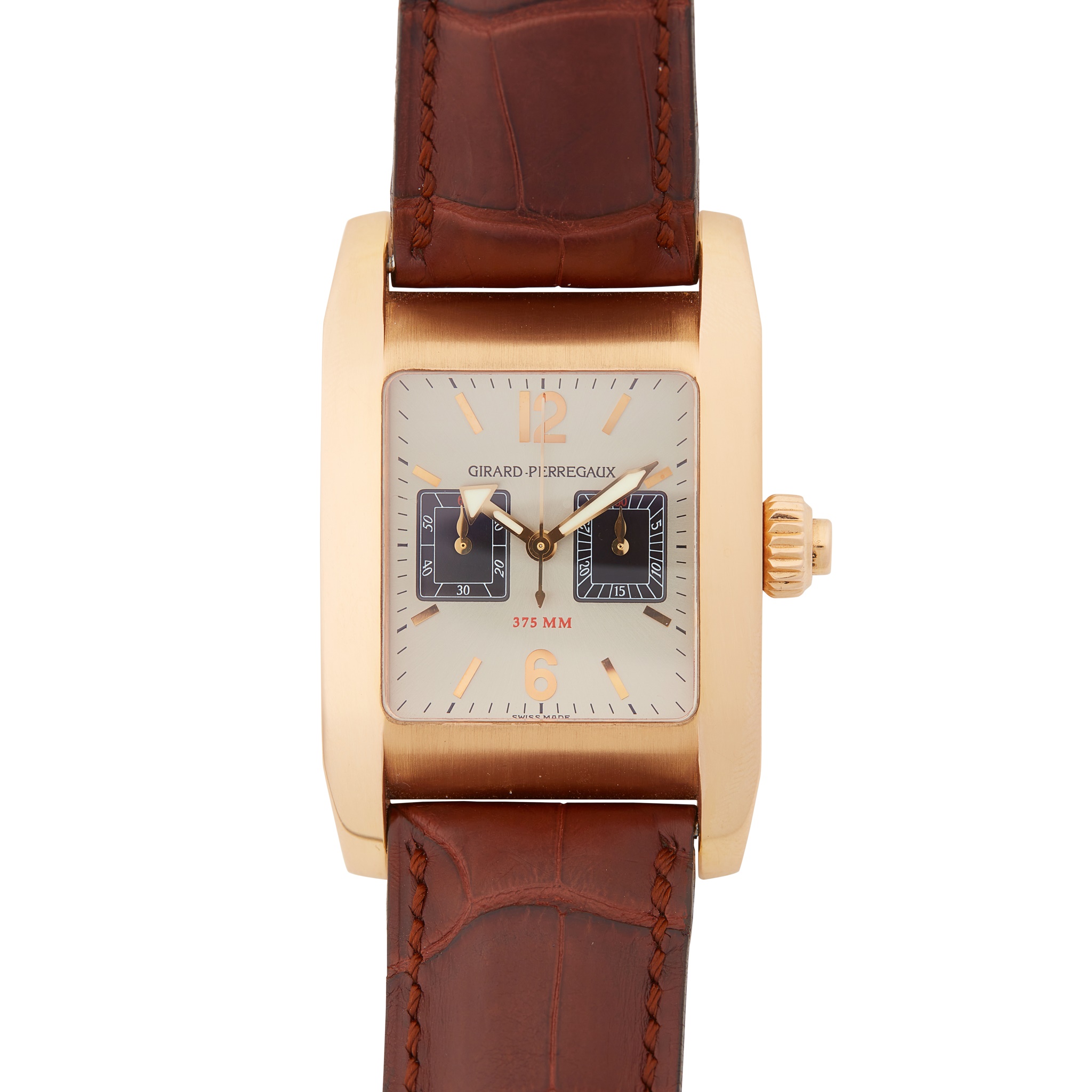 375 Mille Miglia pour Ferrari model, ref. 8050, SPEC52-E, limited edition of 250 pieces, guarantee card dated 2008, manual wind movement, eighteen carat rose gold rectangular case, rectangular silver coloured dial with applied rose gold Arabic 12 and 6 and baton markers, rectangular subsidiary dials for 30 minute register and constant seconds at 3 and 9 in black and with Arabic numerals in red and white, lume filled rose gold sword and arrow terminal hands, pencil centre seconds hand, outer seconds track in black, rectangular curved case, mono-pusher crown, the case back with GIRARD-PERREGAUX SERIE LIMITEE POUR FERRARI 375 MM OR No.166/250 Ref.8050, on signed Girard-Perregaux brown strap, signed clasp, in box, with outer box and guarantee card