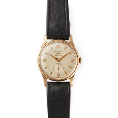 1950s, automatic model, 9ct gold case, the round silvered dial with applied gold Arabic numerals and bevelled wedge hour markers, sunken small seconds at 6, outer seconds track, gold sword hands, the caseback engraved D. C. Thomson & Co. Limited. J. N. Fraser 1904-1954, on a later black strap, in original box, lacking papers, with accompanying information booklet 'A Glasgow Newspaper Office and its Equipment.' Note: please see the full feature on the history of this watch in the News section at lyonandturnbull.com