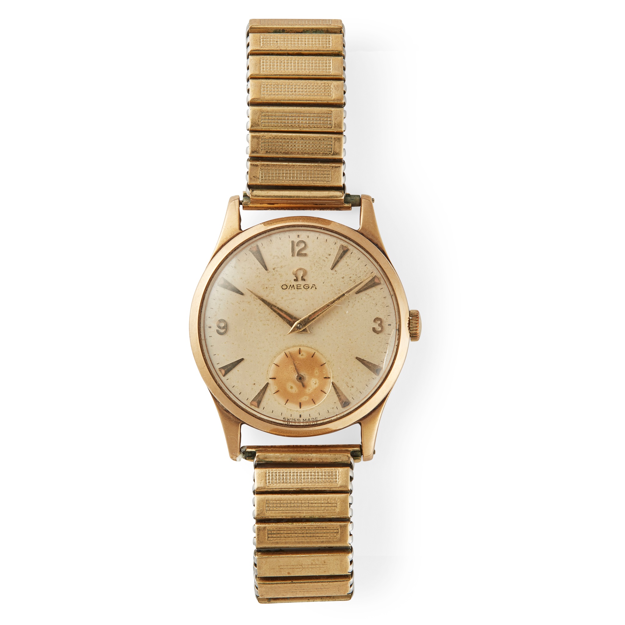 1960s, signed Omega 17 jewel 266 calibre manual wind movement, 9ct gold case,numbered 13949810, round buff dial with applied gold Arabic 12, 3 and 9, arrow head hour markers, sunken small seconds at 6, gold sword hands with lume inserts, on a generic expanding bracelet strap, no box and papers