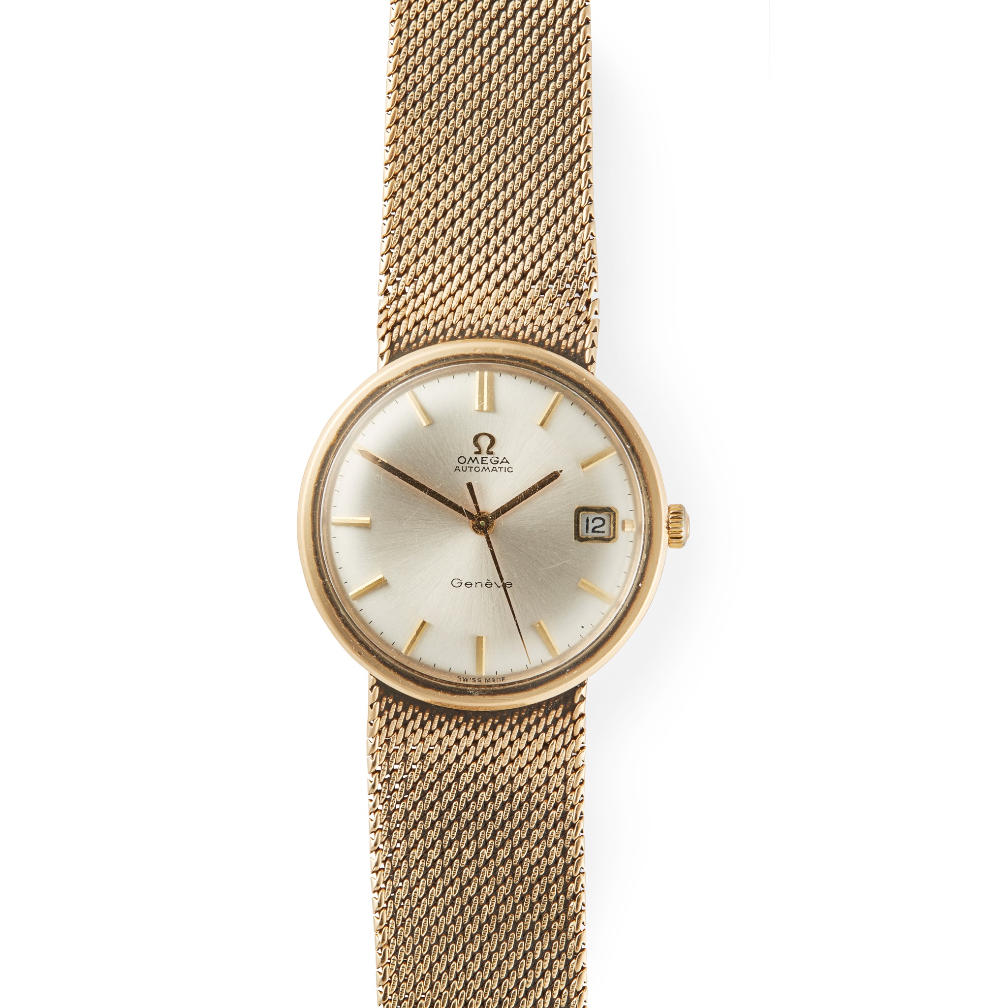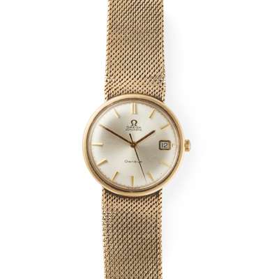 Automatic Geneve example, 1960s, in an 18ct gold case, the round silver coloured pie pan dial with applied gold baton hour markers, date aperture at 3, gold pencil hands, centre seconds hand in gold, the caseback inscribed R. B. McIntosh, on an integrated 18ct gold mesh bracelet strap with fold over snap clasp with Omega logo, no box and papers