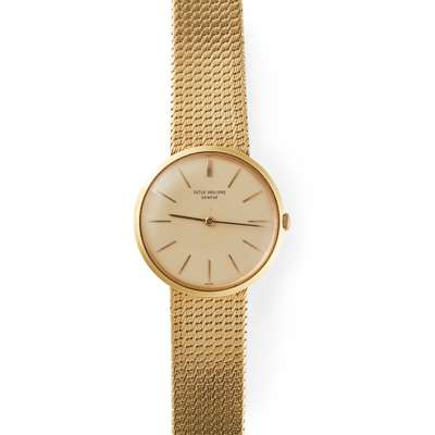 manual wind model, in an 18ct gold case, round buff dial with applied gold baton hour markers, the case with engraved initials, on an integrated 18ct gold mesh bracelet strap with signed fold over snap clasp with Patek Philippe Calatrava cross logo, in box, no papers