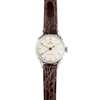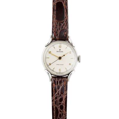 Precision model, 1940s, signed 17 jewel manual wind movement, round silver coloured dial with applied gold coloured Arabic numerals and arrowhead hour markers, outer seconds track in black with Arabic numerals, bevelled gold coloured hands, centre seconds hand in black, fancy curved lugs, with Rolex coronet to the caseback, on a modern strap, no box or papers