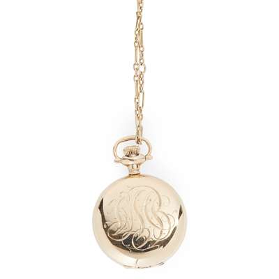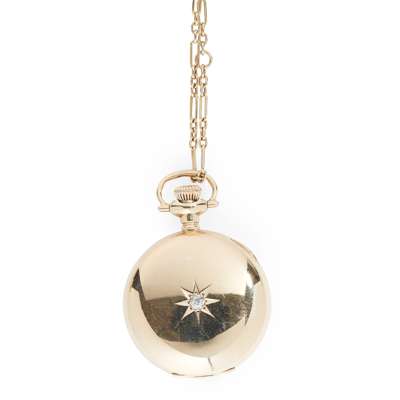full hunter, keyless wind, signed Lady Elgin movement, early 20th century, the round white enamel dial with Arabic numerals in black, outer seconds track in black with Arabic numerals in red, blued steel leaf hands, with monogram to the case front, the caseback with a star set old cut diamond, on an unmarked chain