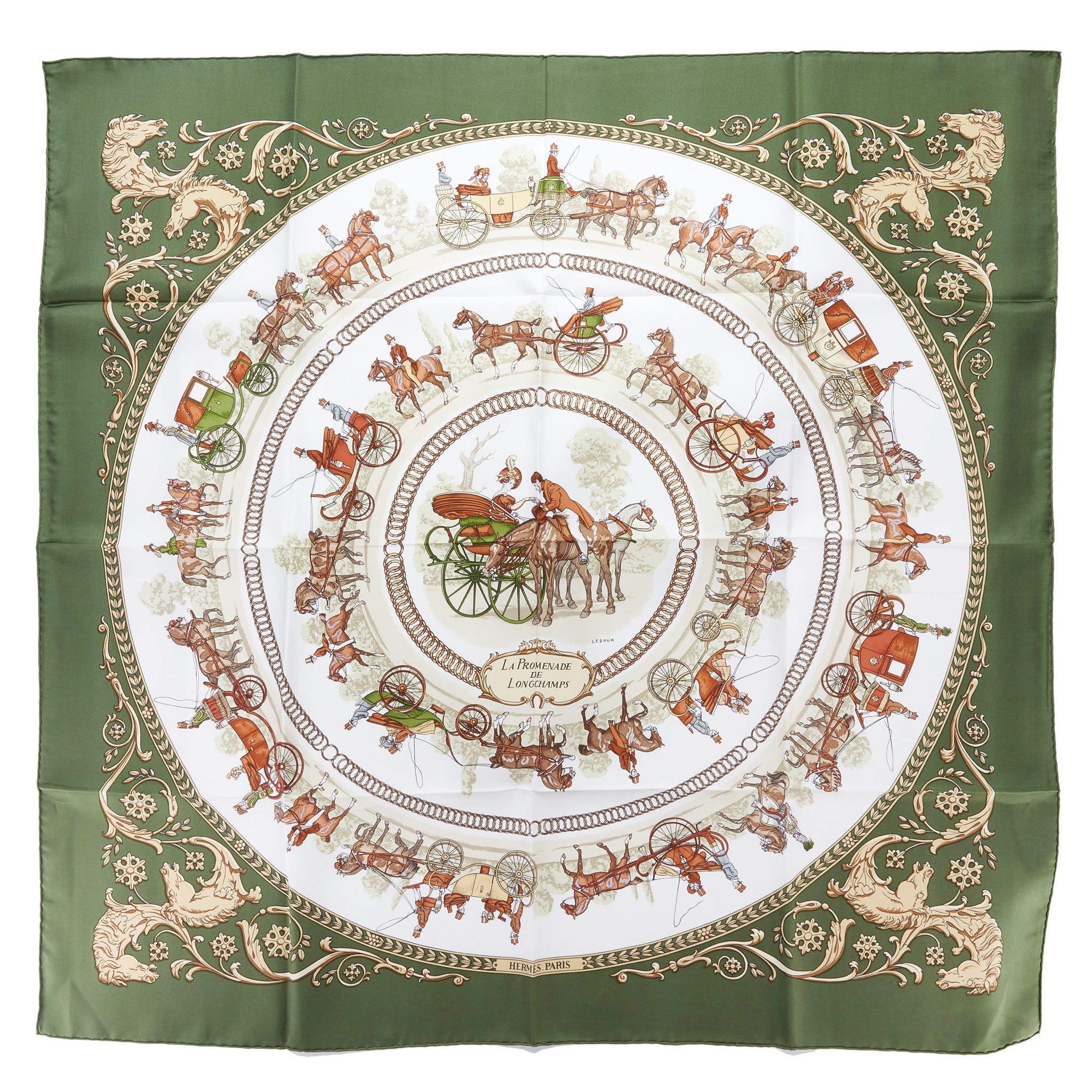 La Promenade De Longchamps by Ledoux, green, ivory and brown silk