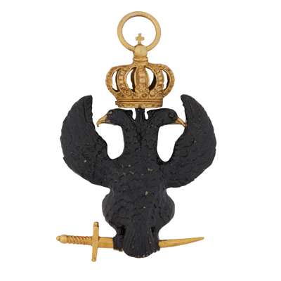unmarked, as a double headed eagle with hinged yellow metal crown, clutching a sword in the claws